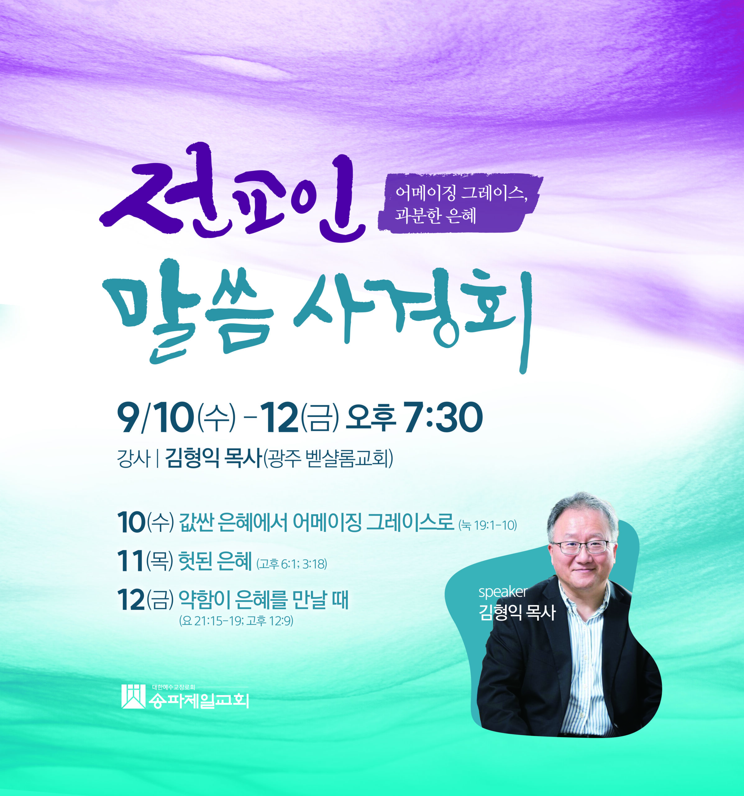 전교인 말씀사경회 News 전교인 말씀사경회 2025년 전교인 말씀사경회 일시: 9/10(수)~12(금) 오후7:30 강사: 김형익 목사(광주 벧샬롬교회) 주제 10(수): 값싼 은혜에서 어메이징…songpamm9월 25, 2025